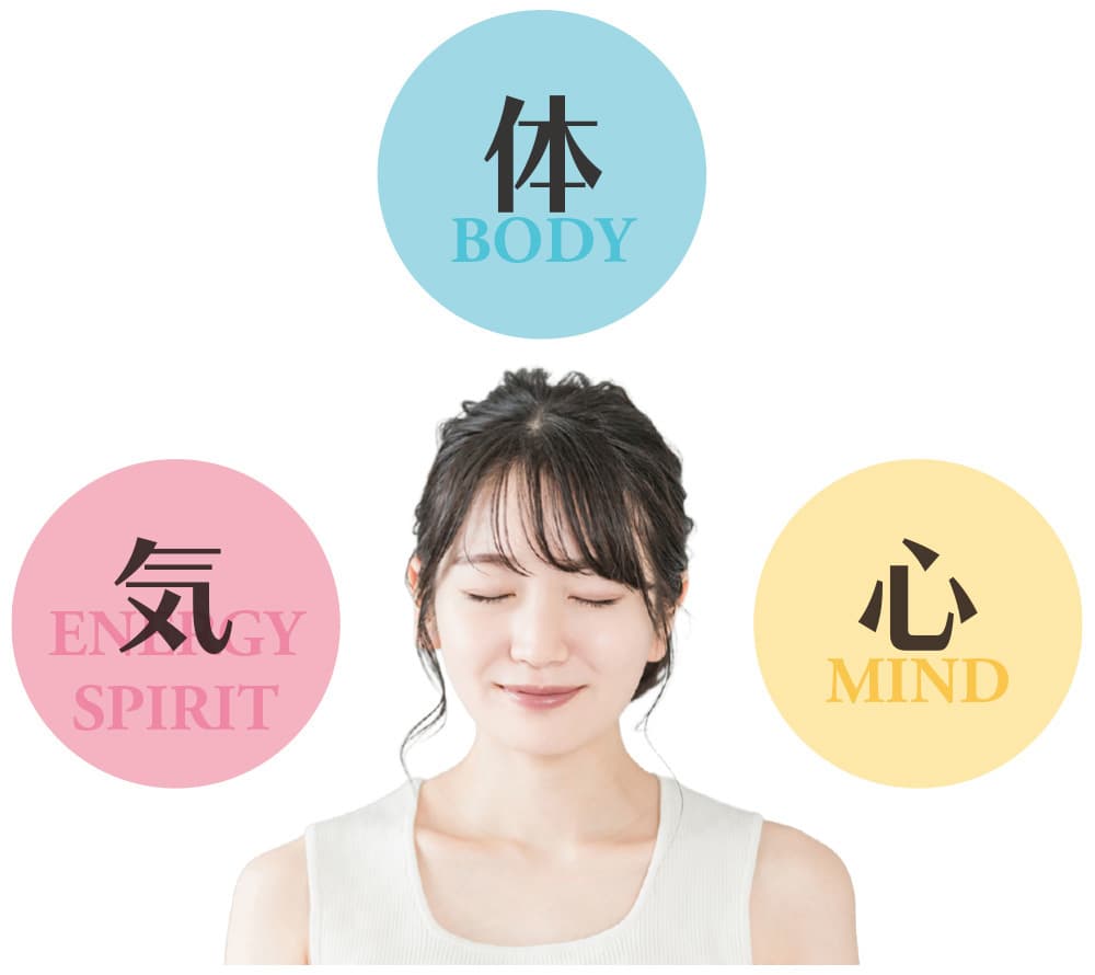 ホリスティックとは、「体(BODY)・心(MIND)・気(ENERGY/SPIRIT)」のこと。この3つが健全な状態で整うと、人は自然と元気・健康・幸せ、そして良い流れ(強運)のサイクルが回りはじめます。