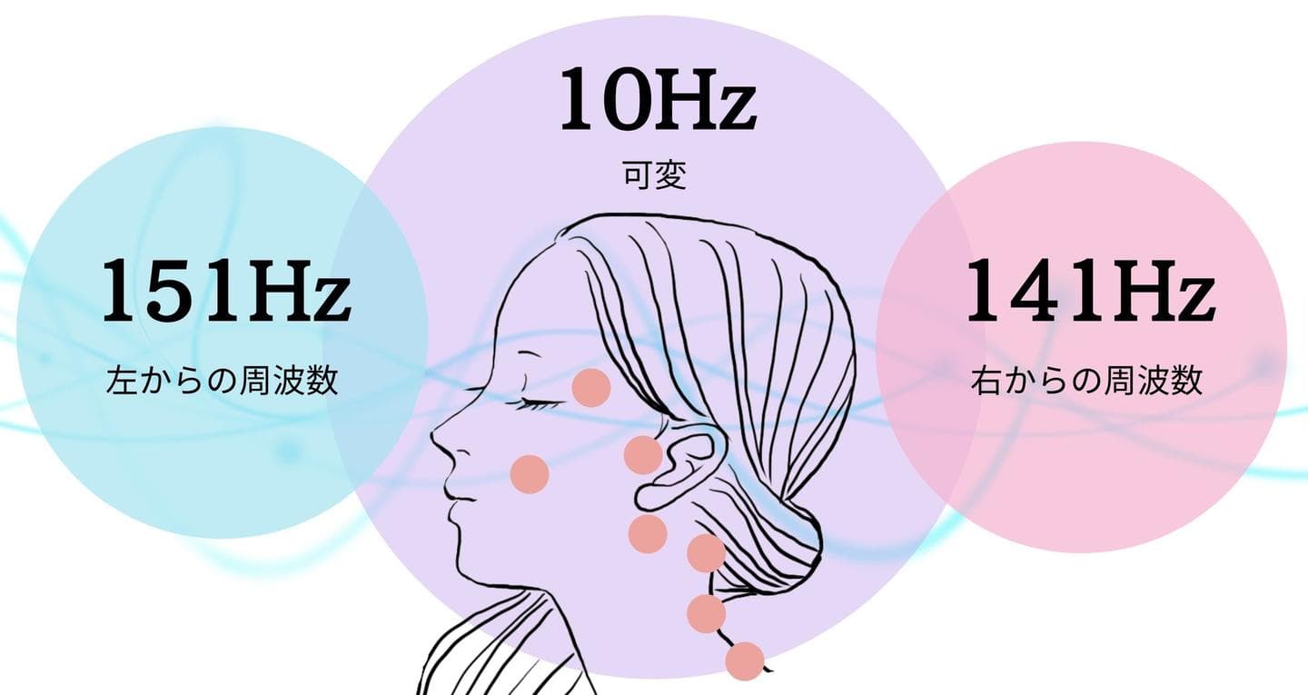電気信号の2つの異なった周波数を混合することにより発生した干渉波が脳の深層部に達し、脳波をアルファ波、シータ波に誘導します。